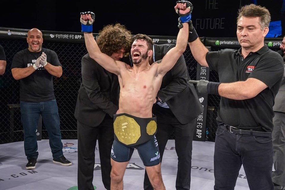 O peso-mosca Adriano Ramos escreveu seu nome na história do Future FC. Na luta principal da 5ª edição do evento, realizada nessa sexta-feira no Centro Universitário Ítalo Brasileiro, em São Paulo-SP, o atleta da Inside finalizou Elton Alves com um mata-leão no segundo round e se sagrou o primeiro campeão da organização. De quebra, Adrianinho também faturou um dos bônus de performance, embolsando US$ 500 (cerca de R$ 2 mil) além da bolsa, e o contrato com o LFA. Na entrevista ainda dentro do decágono, ele mandou um recado para o cubano Maikel Perez, atual campeão do evento americano.