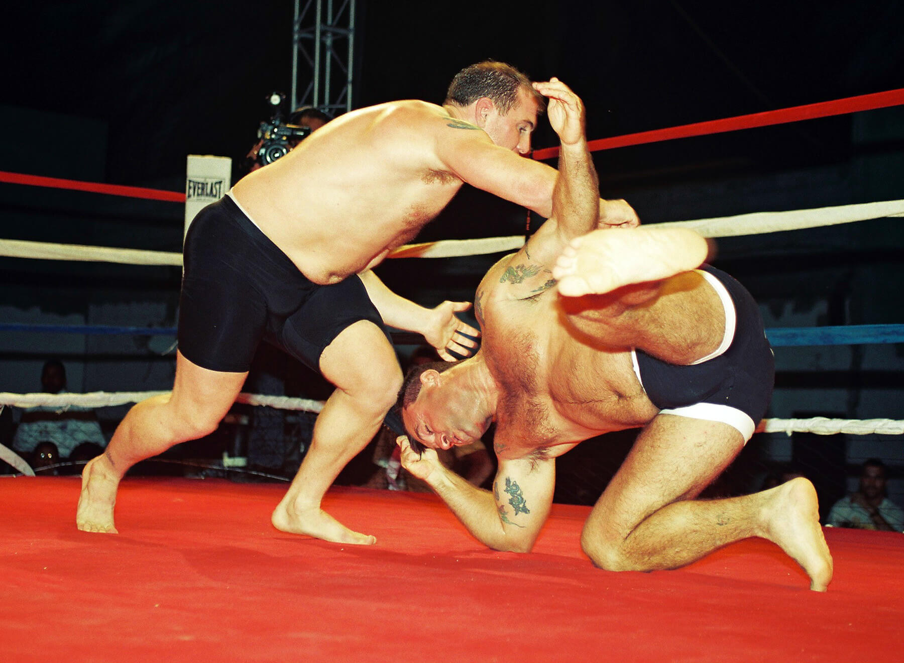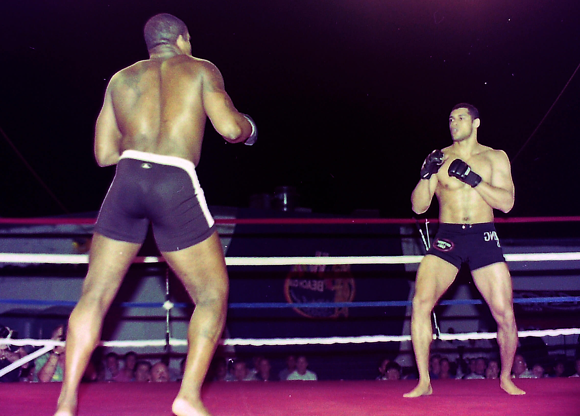 “O Muay Thai no Brasil deve ser tão bom quanto o Jiu-Jitsu holandês”. A ironia do holandês Gilbert Yvel assim que o encontrei pela primeira vez no lobby do hotel Havana em Aruba e perguntei se esperava um duelo de strikers com seu oponente da Chute Boxe, já me levou a antever que o clima nos bastidores seria tenso. Dito e Feito. Duas semanas após a estreia vitoriosa de Wanderlei Silva no Pride 7 na categoria até 90kg, Rudimar Fedrigo chegou a ilha caribenha com sua grande aposta no peso-pesado, Fábio Piemonte. Apesar de só ter lutado uma vez nas regras do Vale-Tudo, quando liderou a equipe Chute Boxe nocauteando Kunta Kinte na luta principal do histórico desafio com a capoeira em 1993, Fabião se destacava nos sparrings na academia e era tido como aposta certa por Rudimar, tanto que o mestrão aceitou testá-lo com Yvel que já tinha 18 lutas de Vale-Tudo.