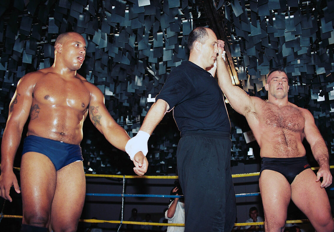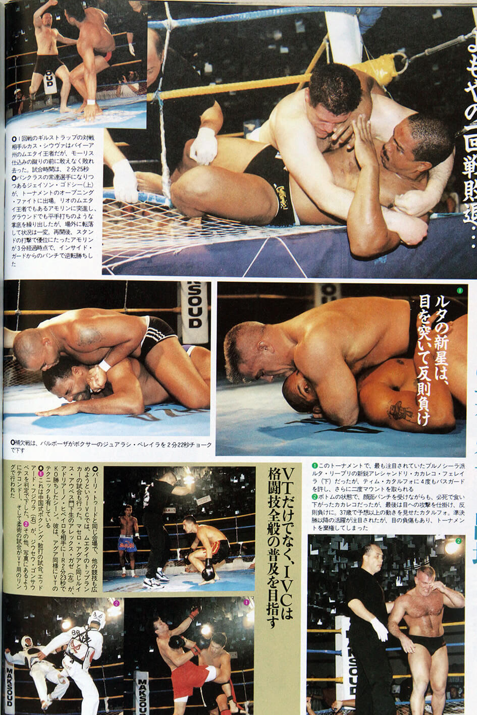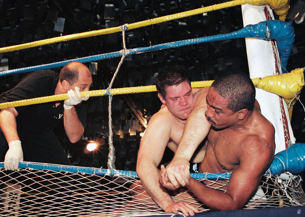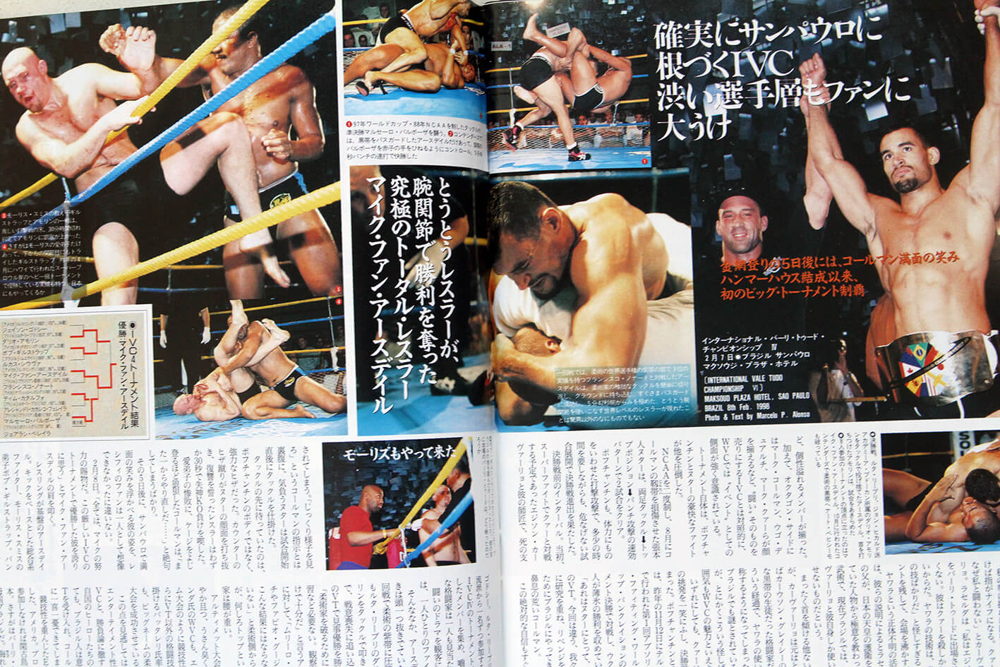 Depois de 30 minutos de guerra, Amorim teve menos de meia hora para se recuperar e voltar ao ringue para enfrentar Mike Van Arsdale. Obviamente não deu nem para o começo. Dario conseguiu se defender bem de duas tentativas de queda, mas na terceira foi arremessado e caiu com o ombro no chão, pedindo que o juiz interrompesse o combate a 2min42s de luta. Diante de uma silenciosa platéia que parecia relembrar o trauma de Gurgel no ano anterior, Mike recebeu o cinturão de campeão do IVC das mãos do promotor Sérgio Batarelli. Ao final do evento, ao responder uma pergunta que fiz sobre sua habilidade no chão (ao finalizar Nonato), fez questão de alfinetar os rivais do Jiu-Jitsu. “Vencer o Jiu-Jitsu não tem mistério. É só observar, não preciso praticá-lo”. Assim como Kerr, que após vencer o IVC foi levado ao UFC, Arsdale fez sua estreia no evento americano três meses após a vitória sobre Dario, vencendo Joe Pardo em 11 minutos de luta, novamente com uma Kimura.