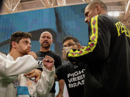 - mas conseguiu raspar e pegar as costas do atleta da Luta Livre, finalizando com um mata-leão