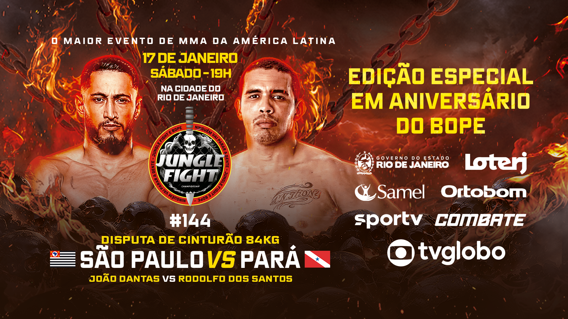 O Jungle Fight 144 será realizado no próximo dia 17 de janeiro, na sede do Batalhão de Operações Policiais Especiais, no Rio de Janeiro, em edição especial em homenagem aos 48 anos do Bope, celebrados no dia 19. O evento marca a abertura da temporada 2026 do Jungle Fight, maior organização de MMA da América Latina, com transmissão nos canais Sportv e Combate, a partir das 19h.