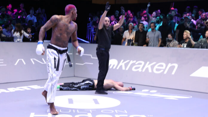 ‘Jones’ estreou entre os medios (até 84kg) contra Palatnikov. Com vantagem significativa de envergadura, o brasileiro começou melhor, acertando socos retos e chutes na coxa. Palatnikov então passou a buscar a luta agarrada. Mas em um dos clinches, ‘Jones’ o projetou para trás. Com o impulso, ele chocou a cabeça contra o solo e acabou nocauteado.