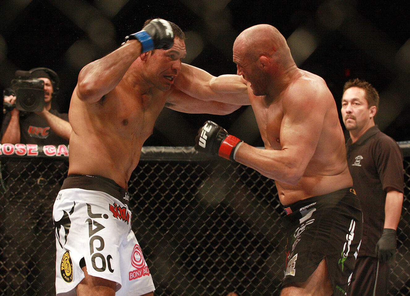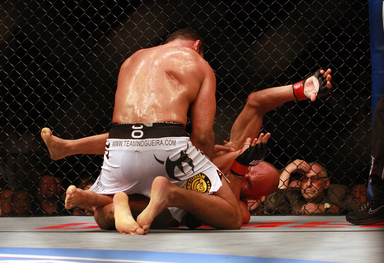 No octagon, nem mesmo os quase 14 mil presentes no Rose Garden Arena foram suficiente para vencer a obstinação do baiano de 33 anos, que já foi atropelado por um caminhão aos 11 e conseguiu dar a volta por cima e se consagrar nos ringues de MMA, vencendo gigantes como Bob Sapp e Cro Cop. O combate não poderia ser mais emocionante. Randy sabia que não seria um bom negócio levar o campeão de Jiu-Jitsu para o solo e veio preparado para decidir a luta em pé, vindo com tudo para cima do baiano. Mas com o Boxe afiado, e um poder de absorção acima da média, Rodrigo conseguiu resistir aos bons golpes encaixados pelo veterano de 46 anos nos minutos iniciais e virar a luta levando o wrestler americano para o solo com dois knock downs, que definiram os dois rounds iniciais. Com o wrestler de costas no chão, o campeão de Jiu-Jitsu passeou e chegou perto de finalizá-lo em três oportunidades, mas com o apoio da torcida, Couture se superava e conseguia voltar em pé. O último minuto do terceiro assalto foi um retrato do combate. Minotauro nas costas de Couture tentando estrangulá-lo, o americano conseguindo escapar, caindo na guarda do brasileiro e acertando alguns golpes perigosos. Quando a torcida já começava a gritar, comemorando o que parecia uma reação, Rodrigo raspa e cai montado, até o gongo soar, decretando o fim dos 15 minutos de um combate que, segundo o próprio promotor, Dana White, entrou para a história como um dos melhores destes 16 anos de UFC.