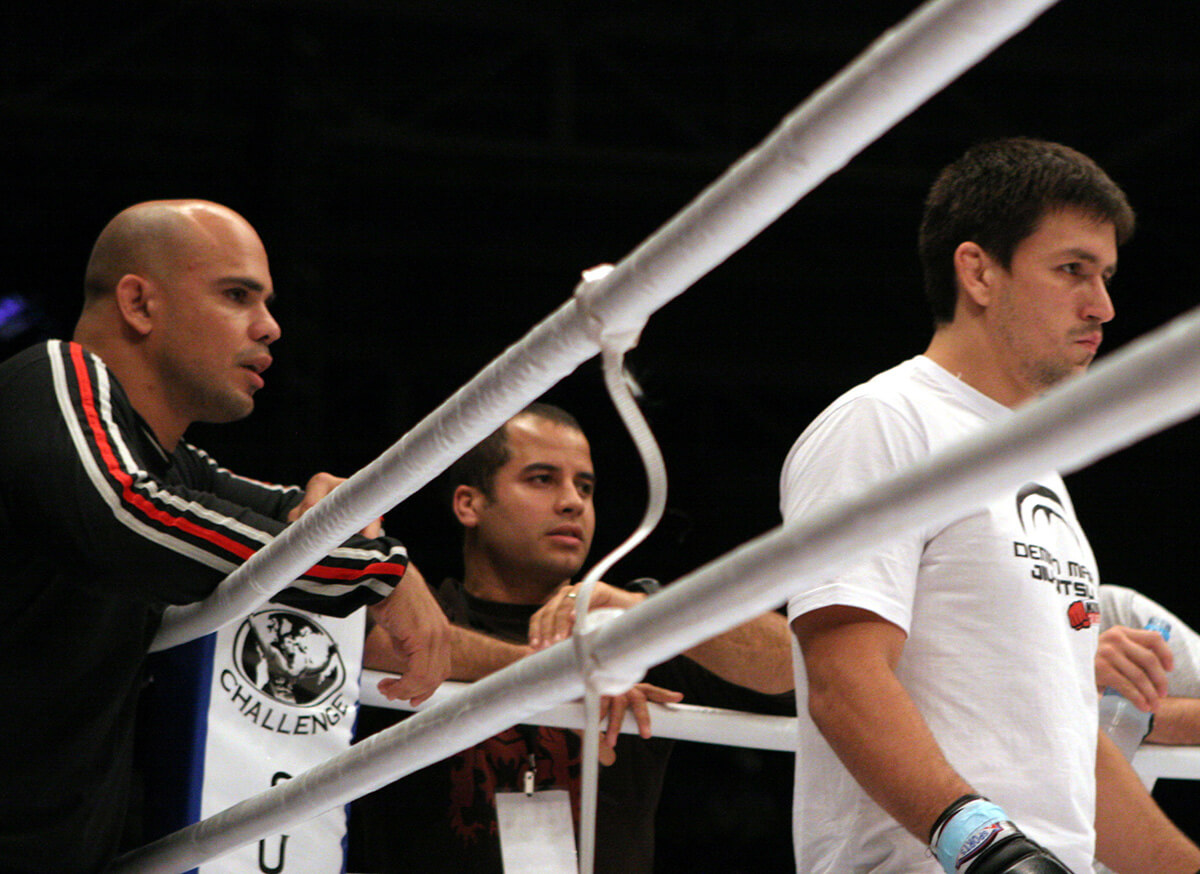 Demian e seus cornermen, os faixas-pretas Castello Branco e Léo Vieira