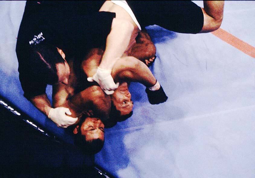 O americano escapou e partiu pra cima do brasileiro que, encurralado nas grades, levou uma serie de 15 socos no rosto e na nuca, obrigando Big John a interromper a luta.
